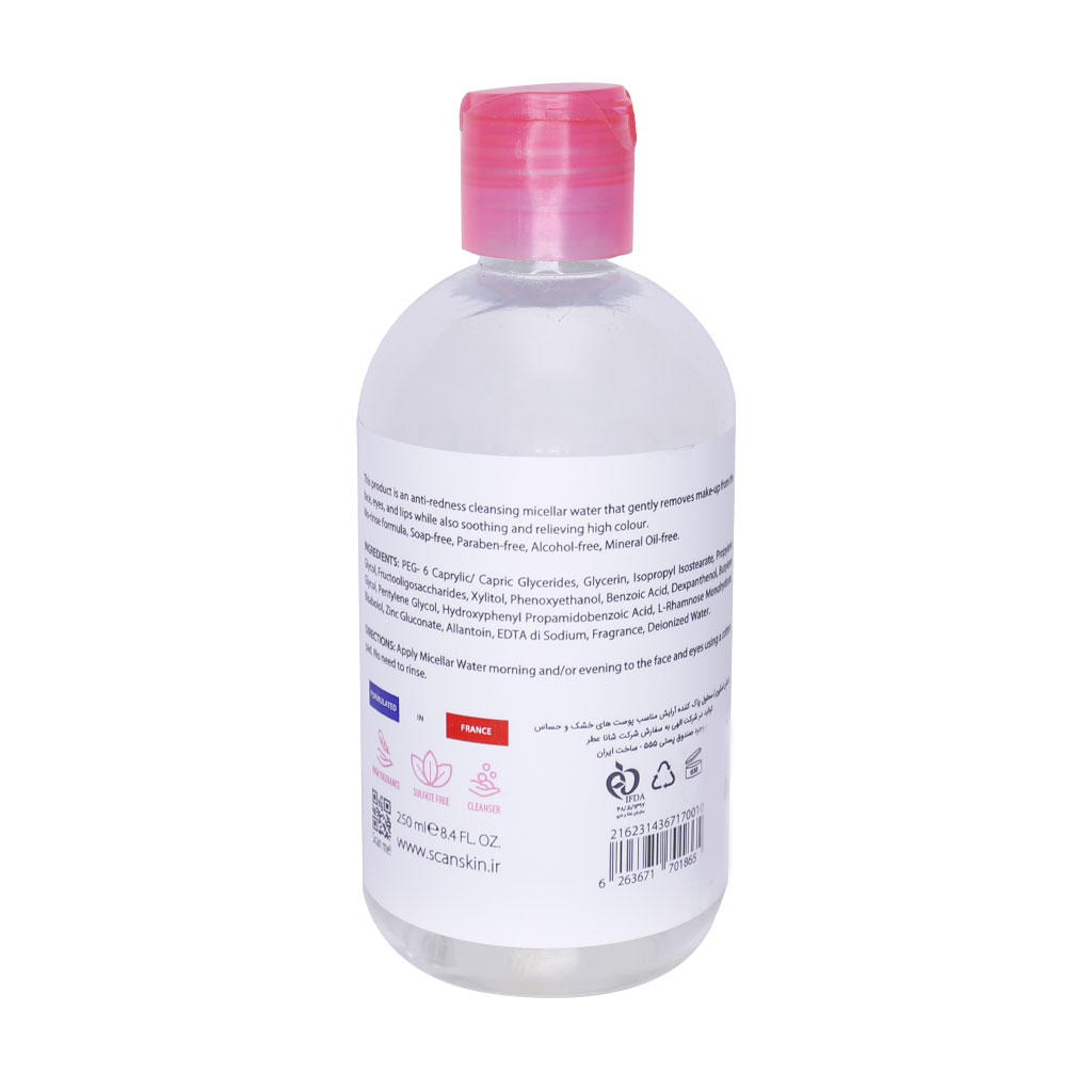 برند اسکن اسکین یک برند ایرانی است و در زمینه تولید محصولات مراقبت از پوست فعالیت میکند. محصولات این برند از کیفیت بسیار بالایی برخوردار هستند. برند اسکن اسکین دو مدل میسلار واتر تولید و روانه بازار کرده است. محلول پاک کننده آرایش پوست چرب اسکن اسکین و محلول پاک کننده آرایش پوست خشک اسکن اسکین. میسلار واتر به عنوان محلول پاک کننده آرایش نیز شناخته میشود. همانطور که گفته شد قدرت پاک کنندگی محلول پاک کننده آرایش اسکن اسکین در حد مطلوب و راضی کننده است و پس از استفاده نیازی به آبکشی و همچنین استفاده از تونر ندارید. از ویژگیهای محلول پاک کننده آرایش اسکن اسکین مخصوص پوست خشک و حساس میتوان به عدم ایجاد حساسیت، التهاب و خارش پوستی اشاره کرد. این محلول با قدرت آبرسانی بالا خشکی و کشیدگی پوست را برطرف میسازد. این محصول فاقد الکل، پارابن، ترکیبات صابونی و روغنهای معدنی است.