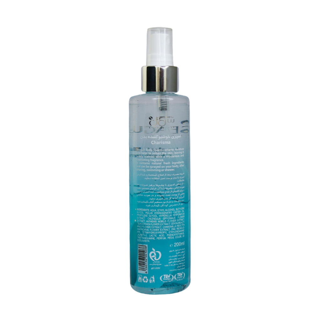 اسپری خوشبو کننده بدن مدل کاریزما سی گل با رایحه دل انگیز خود، بدن را خوشبو و با طراوت می نماید. این بادی اسپلش با کیفیت بسیار بالا و بدون مواد شیمیایی و مضر برای پوست تولید شده است. علاوه بر خوشبو نمودن بدن با ماندگاری بالا و جلوگیری از تعریق بیش از حد بدن، وجود ترکیبات آبرسان از دیگر مزایای این محصول به شمار می رود. اسپری خوشبو کننده بدن سی گل غنی شده با روغن ها، مرطوب کننده ها  و ترکیبات طبیعی است که باعث رطوبت، تازگی و نرمی پوست می شود. این نوع  اسپری های خوشبو کننده بدن که ترکیب اصلی آنها آب و اسانس می باشد، با نام بادی اسپلش نیز شناخته می شوند