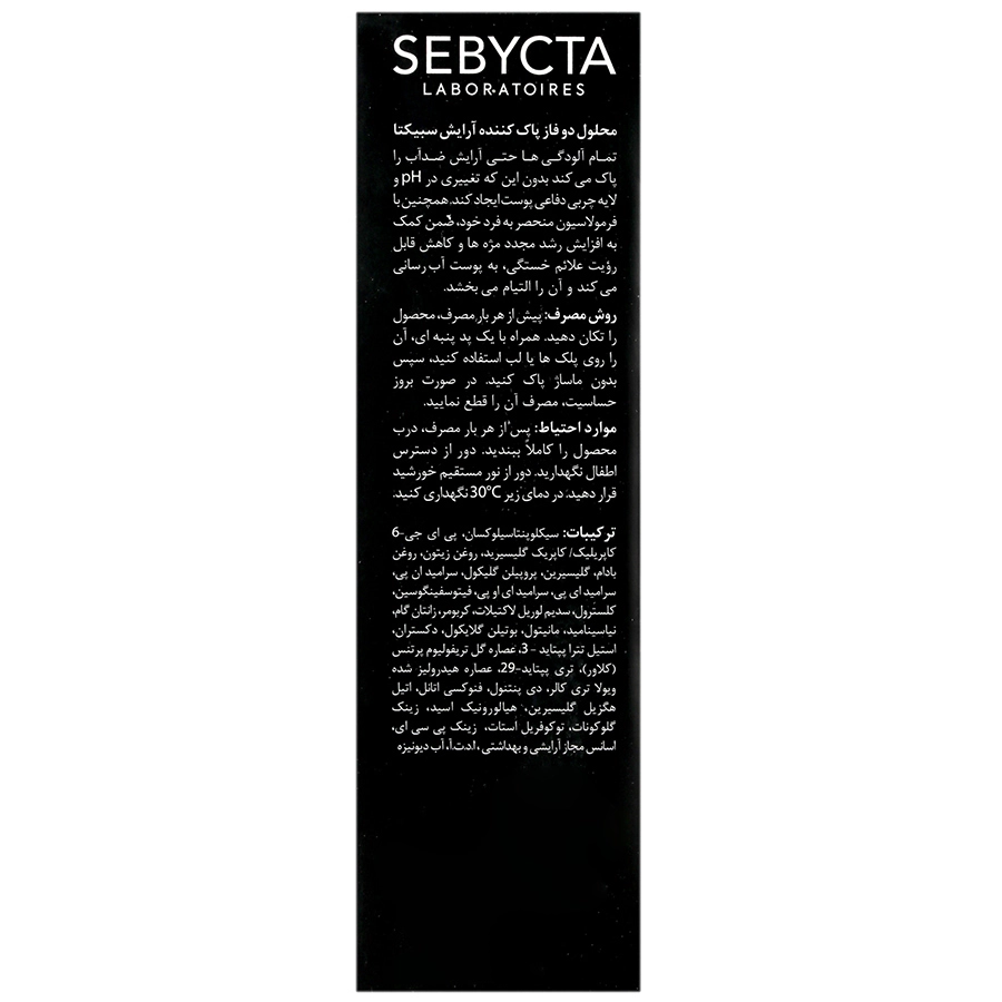 محلول دو فاز پاک کننده آرایش سبیکتا یک محصول حرفه‌ای و چندکاره برای پاکسازی کامل آرایش، به خصوص آرایش‌های ضد آب چشم و لب است. این محلول با فرمولاسیون خاص خود، بدون آسیب رساندن به پوست‌های حساس، به طور موثر باقی مانده آرایش را از سطح پوست پاک می‌کند. ترکیب دو فاز آبی و روغنی این محصول باعث می‌شود حتی مقاوم‌ترین محصولات آرایشی به راحتی و بدون نیاز به مالش شدید پاک شوند.