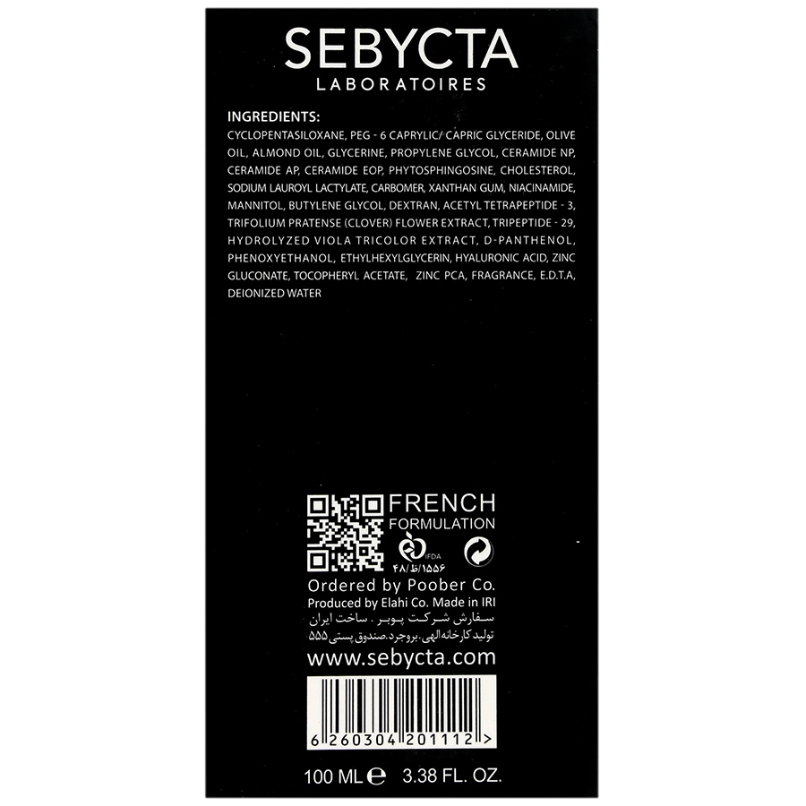 سیکلوپنتاسیلوکسان، پی ای جی-6 کاپریلیک/کاپریک گلیسیرید، روغن زیتون، روغن بادام، گلیسیرین، پروپیلن گلیکول، سرامید ان پی، سرامید ای پی، سرامید ای او پی،فیتوسفینگوسین، کلسترول، سدیم لوریل لاکتیلات، کربومر، زانتان گام، نیاسینامید، مانیتول، بوتیلن گلایکول، دکستران، استیل تترا پپتاید-3 عصاره گل تریفولیوم پرتنس (کلاور)، تری پپتاید-29، عصاره هیدرولیز شده ویولا تری کالر، دی پنتنول، فنوکسی اتانل، اتیل هگزیل گلیسیرین، هیالورونیک اسید، زینک گلوکونات، توکوفریل استات، زینک پی سی ای، اسانس مجاز آرایشی و بهداشتی، ا د ت آ، آب دیونیزه