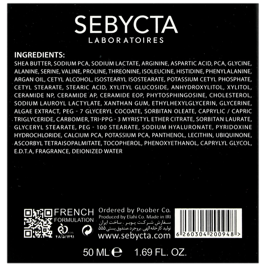 شی باتر، سدیم پی سی ای، سدیم لاکتات، آرژنین، آسپارتیک اسید، پی سی ای، گلایسین، آلانین، سرین، والین، پرولین، ترئونین، ایزولوسین، هیستیدین، فنیل آلانین، روغن آرگان، ستیل الکل، ایزو استئاریل ایزواستئارات، پتاسیم ستیل فسفات، ستیل استئارات، استئاریک اسید، زایلیتیل گلوکوزاید، انیدوزایلیتول، زایلیتول، سرامید ان پی، سرامید ای پی، سرامید ای او پی، فیتوسفینگوسین، کلسترول، سدیم لوریل لاکتیلات، زانتان گام، اتیل هگزیل گلیسیرین، گلیسیرین، عصاره جلبک، پی ای جی -7 گلیسیرین کوکوات، سوربیتان اولئات، کاپریلیک/کاپریک تری گلیسیرید، کربومر، تری-پیپی جی-3 میریستیل اتر سیترات، سوربیتان لورات، گلیسریل استئارات، پی ای جی 100 استئارات، سدیم هیالورونات، پیریدوکسین هیدروکلراید، کلسیم پی سی ای، پتاسیم پی سی ای، پنتنول، لسیتین، یوبی کینون، اسکوربیل تتراایزوپالمیتات، توکوفرول، فنوکسی اتانل، کاپریلیل گلایکول، ا د ت آ، اسانس مجاز آرایشی و بهداشتی، آب دیونیزه