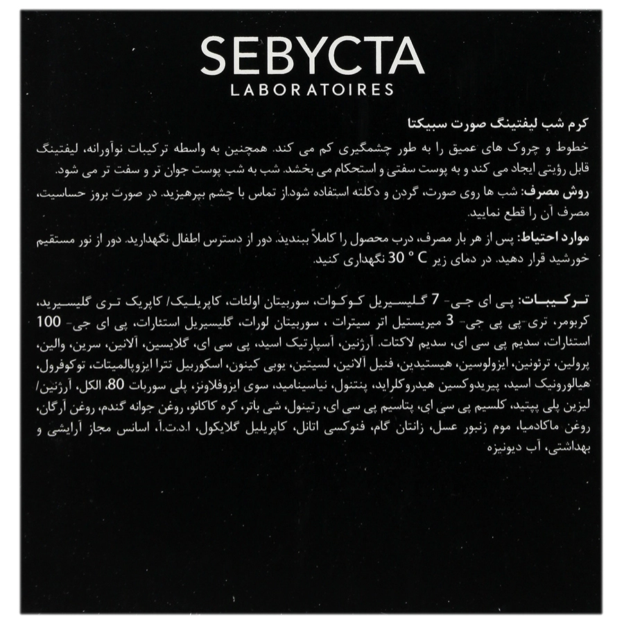 کرم شب لیفتینگ صورت سبیکتا با ترکیبی از مواد ضد پیری و تقویت کننده، به کاهش خطوط ریز، پیشگیری از تخریب پروتئین‌های پوستی و افزایش استحکام پوست کمک می‌کند. این کرم مخصوص استفاده شبانه بوده و مناسب پوست صورت، گردن و دکلته است.