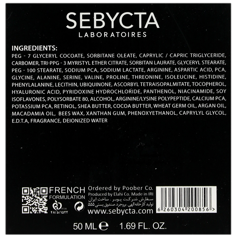 پی ای جی-7 گلیسیریل کوکوات، سوربیتان اولئات، کاپریلیک/کاپریک تری گلیسیرید، کربومر، تری-پی پی جی-3 میریستیل اتر سیترات، سوربتان لورات، گلیسیریل استئارات، پی ای جی-100 استئارات، سدیم پی سی ای، سدیم لاکتات، آرژنین، آسپارتیک اسید، پی سی ای، گلایسین، آلانین، سرین، والین، پرولین، ترئونین، ایزولوسین، هیستیدین، فنیل آلانین، لسیتین، یوبی کینون، اسکوربیل تترا ایزوپالمیتات، توکوفرول، هیالورونیک اسید، پیریدوکسین هیدروکلراید، پنتنول، نیاسینامید، سوی ایزوفلاونز، پلی سوربات 80، الکل، آرژنین/لیزین پلی پپتید، کلسیم پی سی ای، پتاسیم پی سی ای، رتینول، شی باتر، کره کاکائو، روغن جوانه گندم، روغن آرگان، روغن ماکادمیا، موم زنبور عسل، زانتان گام، فنوکسی اتانل، کاپریلیل گلایکول، ا د ت ا، اسانس مجاز آرایشی و بهداشتی، آب دیونیزه