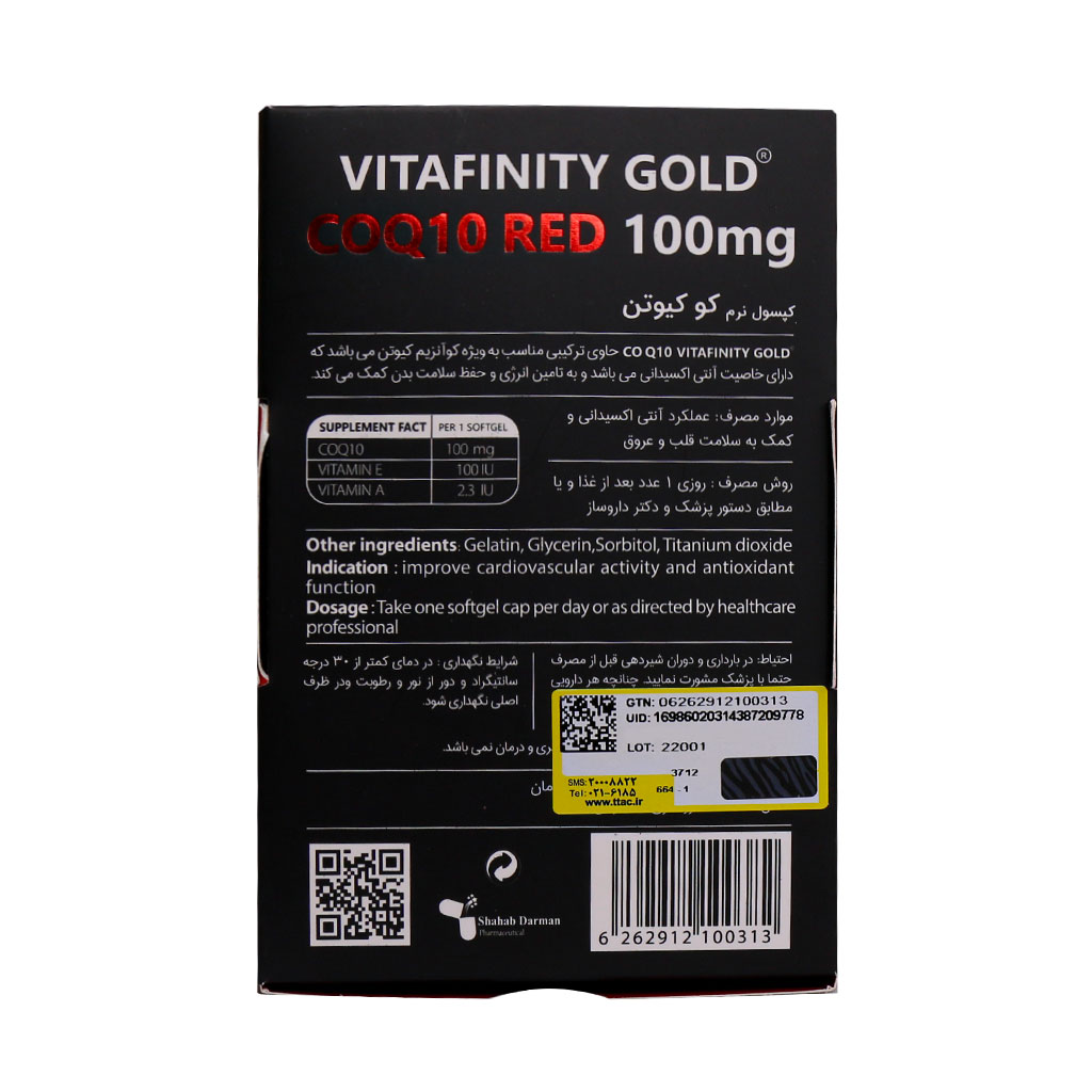 کپسول نرم کوکیوتن قرمز ویتافینیتی گلد شهاب درمان محصولی مناسب برای تقویت سلامت کلی بدن است. مکملهای غذایی در دهههای اخیر بیشتر مورد استقبال قرار گرفتهاند و از دلایل آن میتوان به رژیمهای غذایی خاص، عدم دسترسی به برخی ترکیبات مغذی، نیاز بیشتر بدن به برخی ویتامینها و مواد معدنی و… نام برد. یکی از ترکیبات مغذی که خواص بسیار زیادی برای بدن دارد، کوکیوتن است. در واقع با مصرف کوکیوتن با یک تیر چند نشان میزنید و سلامت ارگانهای مختلفی از بدنتان را تامین میکنید. در هر کپسول از کپسول کوکیوتن قرمز ویتافینیتی گلد، 100 میلی گرم از این ماده وجود دارد که مقدار مناسبی برای مصرف روزانه است. برای آشنایی بیشتر با این ماده، پیشنهاد میکنیم مقاله “خواص کوکیوتن CoQ10 چیست ؟” را مطالعه فرمایید.