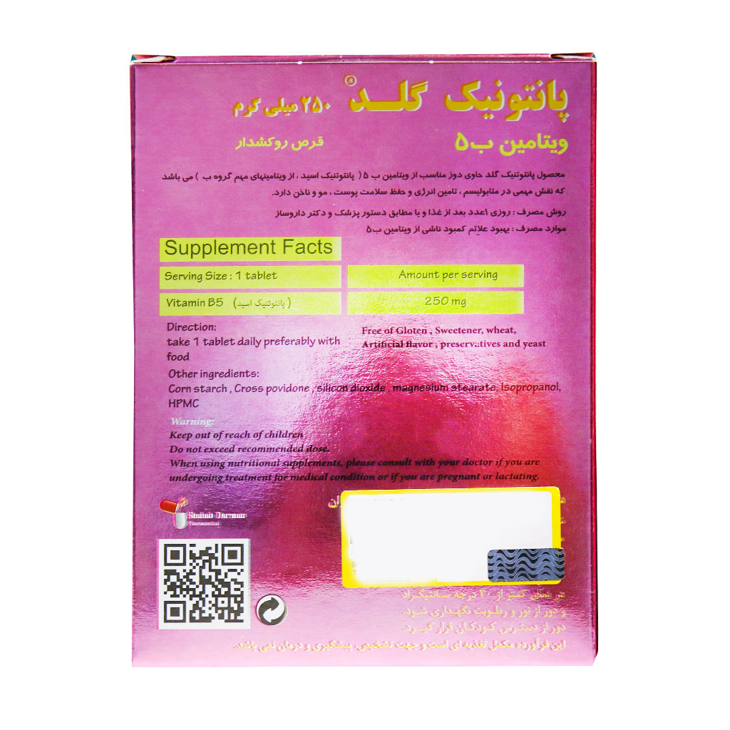 قرص روکشدار پانتونیک گلد شهاب درمان با داشتن 250 میلی گرم ویتامین B5 به علائم کمبود ناشی از این ویتامین کمک کرده و به حفظ سلامت پوست، مو و ناخن و تامین انرژی میپردازد.