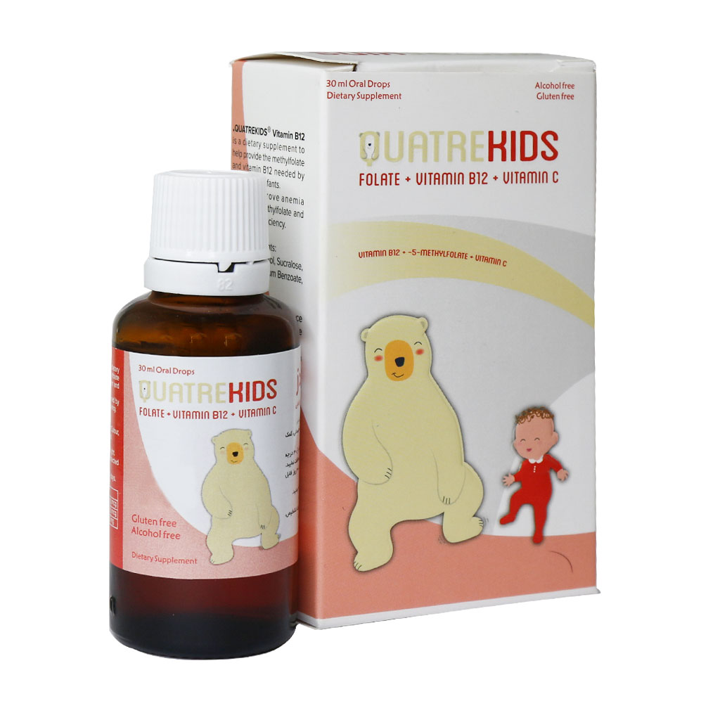 قطره خوراکی کواتر کیدز B12 دارو افشان شایگان با طعم مطلوب به بهبود کم خونی ناشی از فقر فولات و ویتامین ب 12 کودکان کمک میکند.