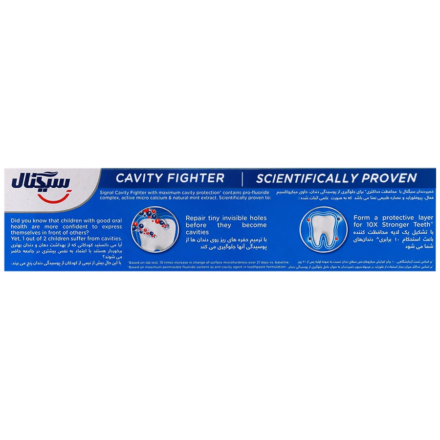 خمیر دندان ضد پوسیدگی سیگنال با از بین بردن نقاط ضعیف دندان با جبران کلسیم از دست رفته، محافظت ۱۲ ساعته در برابر پوسیدگی را فراهم می کند.