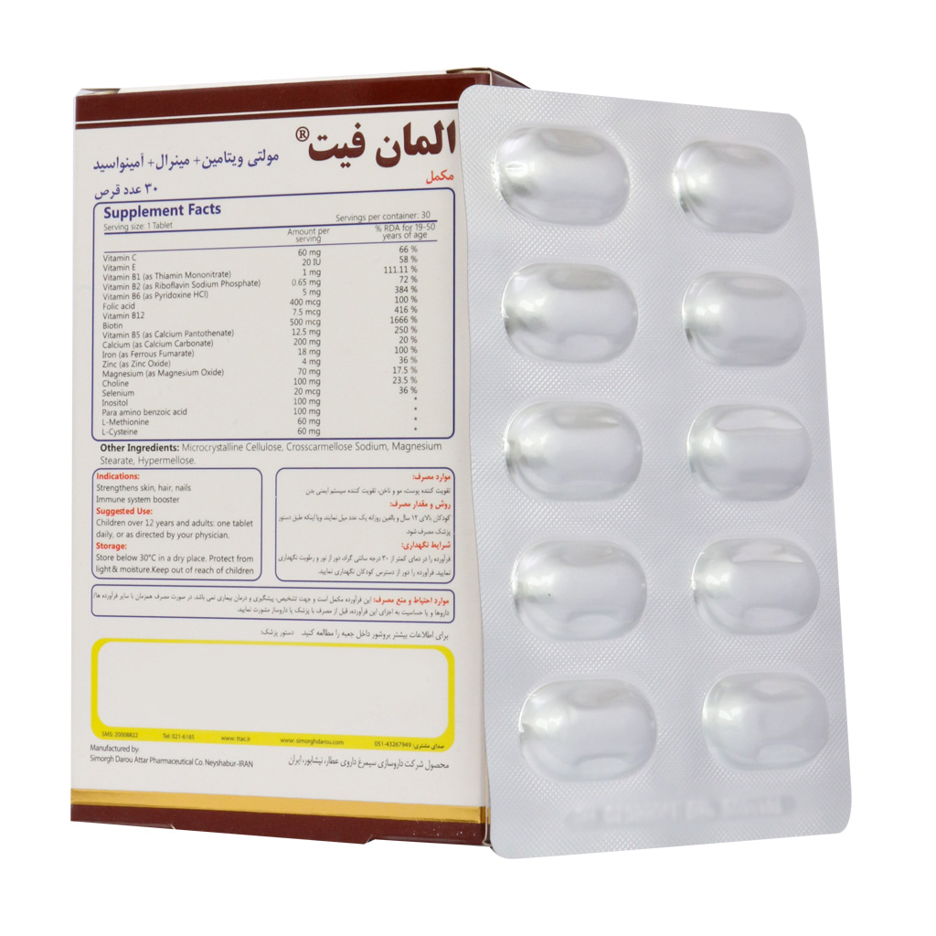 قرص المان فیت سیمرغ دارو عطار مولتی ویتامین، مینرال و غنی از آمینو اسید است که به حفظ سلامت پوست، مو و ناخن کمک میکند. مصرف این مکمل موجب تقویت سیستم ایمنی نیز میشود.