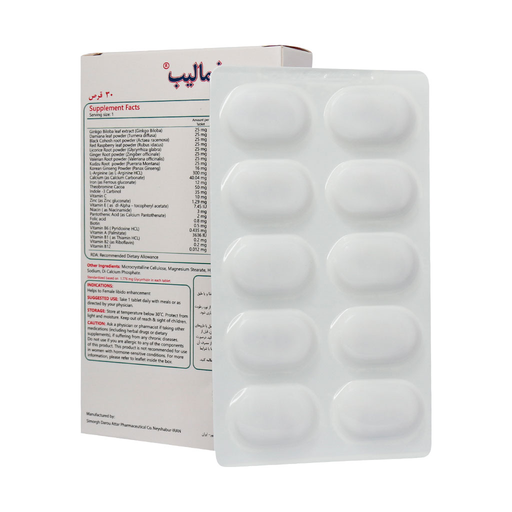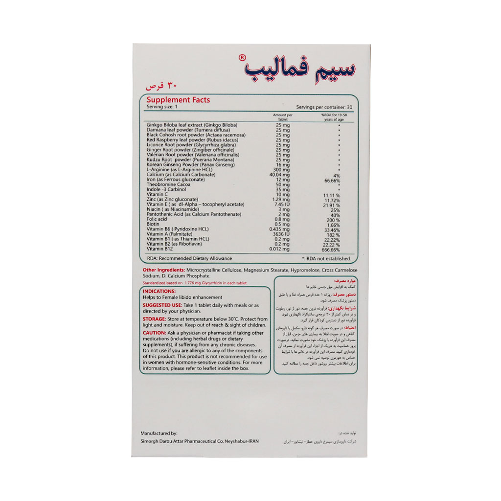 قرص سیم فمالیب سیمرغ دارو عطار حاوی ویتامینهای گروه B، ویتامین A، ویتامین E، ویتامین C، فولیک اسید و … است. این محصول یک مکمل روزانه برای افزایش چشمگیر میل جنسی بانوان بوده و به منظور جبران کمبود تغذیه و عدم تعادل هورمونی ناشی از زمان بارداری، استرس و تغذیه نامناسب کمک میکند.