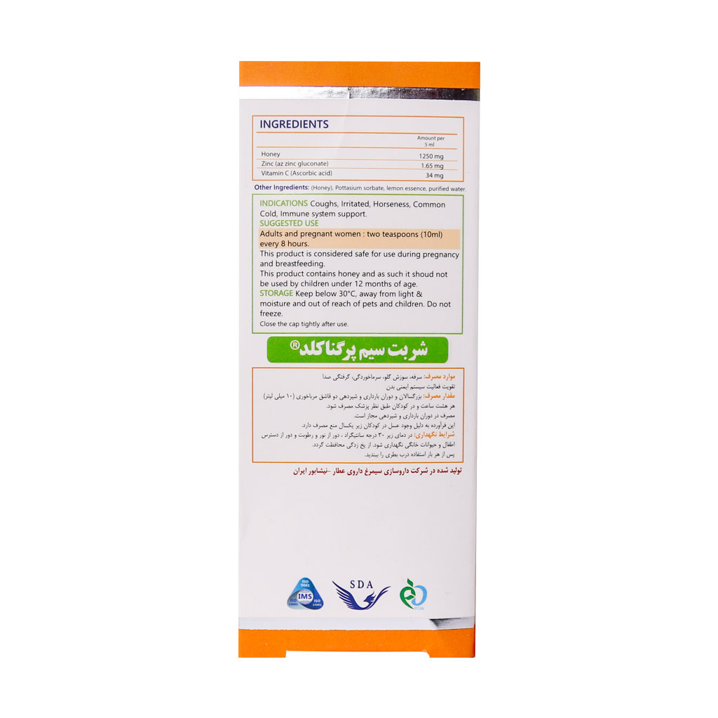 شربت سیم پرگناکلد سیمرغ دارو عطار محصول کشور ایران که موجب تسکین سرفه، سوزش گلو و علائم سرماخوردگی در دوران بارداری و شیردهی و کودکان بالای یک سال میشود.