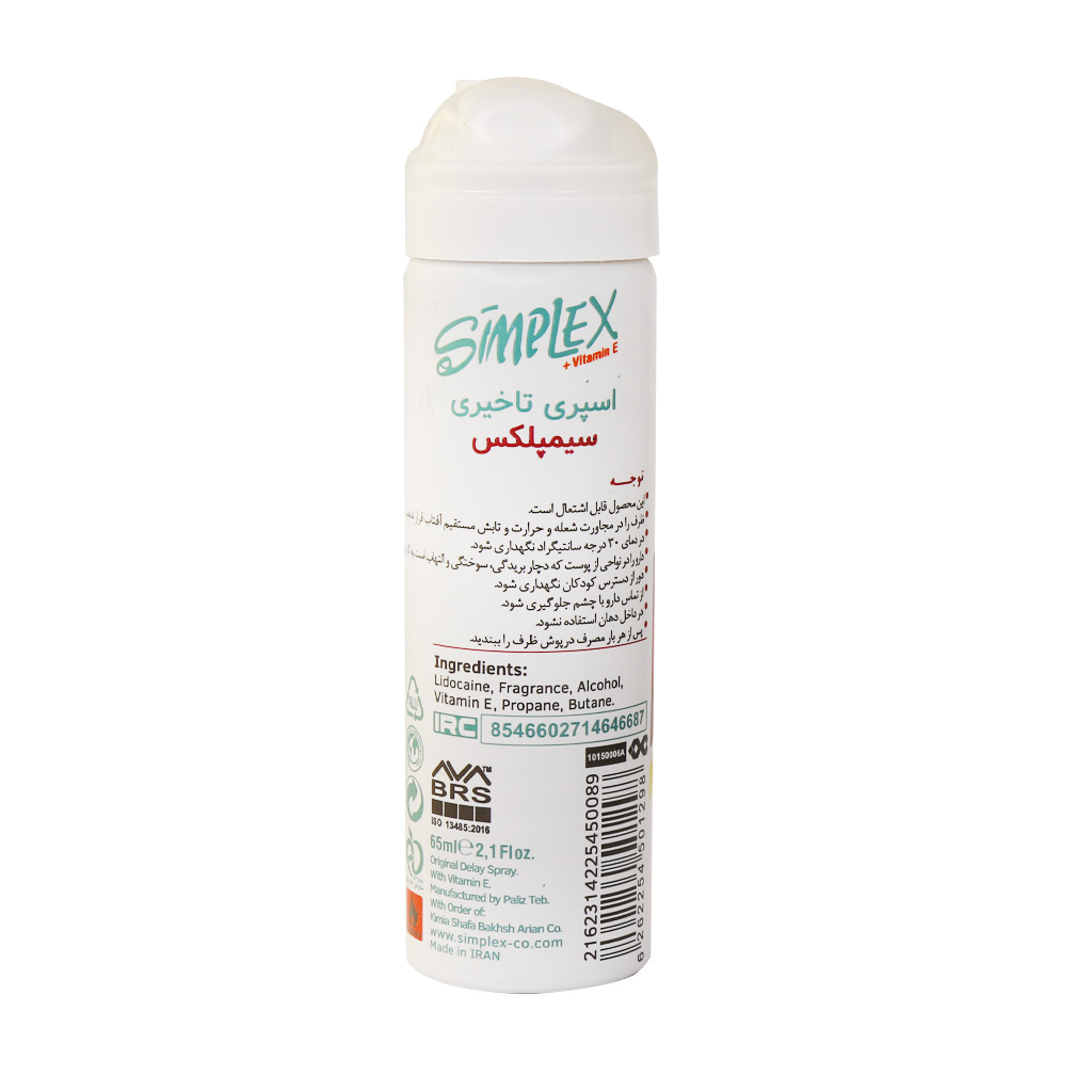 اسپری تاخیری سیمپلکس حاوی ویتامین E برای آقایانی که از مشکل انزال زودرس رنج میبرند، مناسب است و به منظور تاخیر در انزال استفاده میشود. با استفاده از این اسپری نه تنها مشکل زود انزالی شما بهبود مییابد بلکه حس اعتماد به نفس از دست رفته شما نیز باز خواهد گشت. با استفاده درست از این اسپری میتوان در طول مدت یک سال مشکل زود انزالی خود را به صورت همیشگی بهبود ببخشید و به صورت دائم یک رابطه با کیفیت و رضایت بخش را تجربه نمایید.