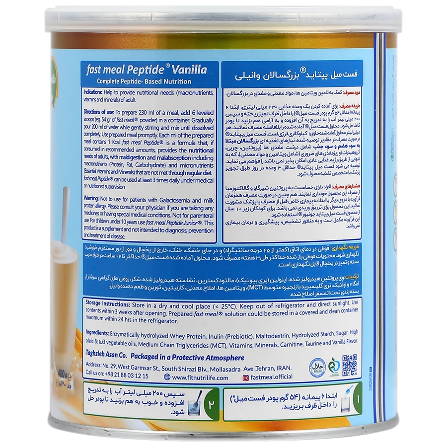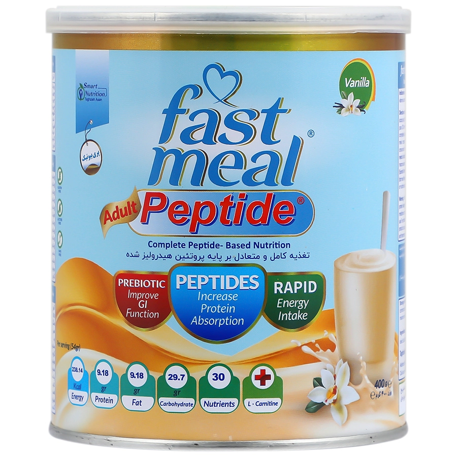 فست میل peptide اسمارت نوتریشن، ساخته شده با فروکتوالیگوساکارید، یک فیبر پروبیوتیک و اینولین پریبیوتیک، به حفظ سلامت گوارش و کاهش مشکلات گوارشی کمک میکند. فست میل پپتاید، جدیدترین غذای کمکی اسمارت نوتریشن است که به شما در تأمین نیازهای روزانه پروتئین، دستیابی به وزن سالم و رفع نیازهای مولتیویتامینیتان کمک میکند. هر میلیلیتر پودر فست میل پپتید حاوی ۱ کیلوکالری انرژی است که بزرگسالان میتوانند آن را به عنوان وعده غذایی یا میان وعده مصرف کنند.