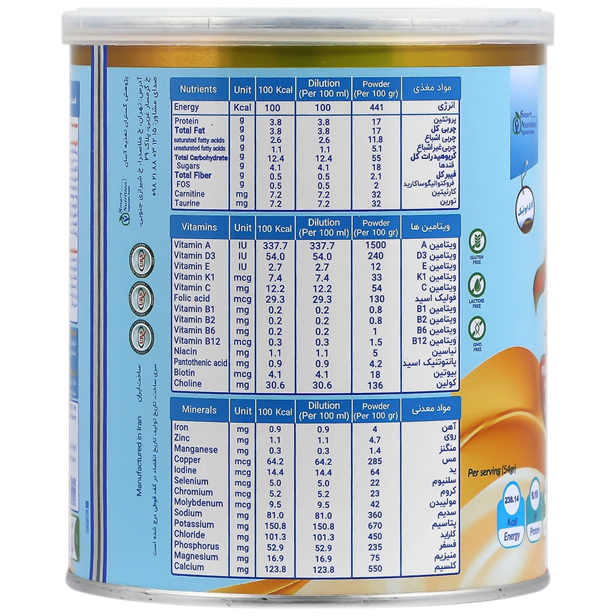ترکیبات: وی پروتئین هیدرولیز شده، اینولین (پری بیوتیک)، مالتودکسترین، نشاسته هیدرولیز شده، شکر، روغن های گیاهی سرشار از امگا3 و اولئیک تری گلیسیرید با زنجیره متوسط (MCT)، ویتامین ها، املاح معدنی، کارنیتین، تورین و طعم دهنده وانیل.