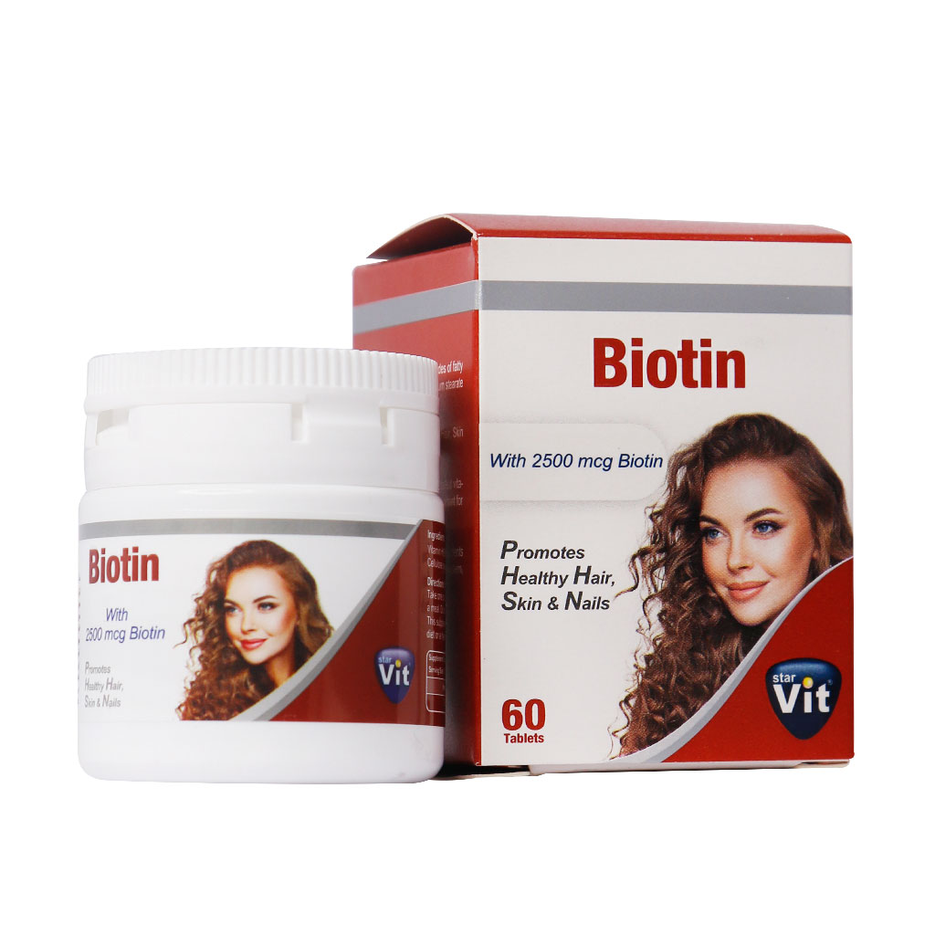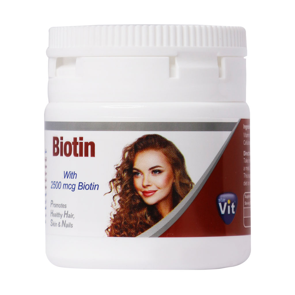 قرص بیوتین استار ویت با داشتن 2500mcg ویتامین B7 در هرقرص، به شما کمک میکند تا رشد و سلامت پوست، ناخن و موهایتان را شاهد باشید.