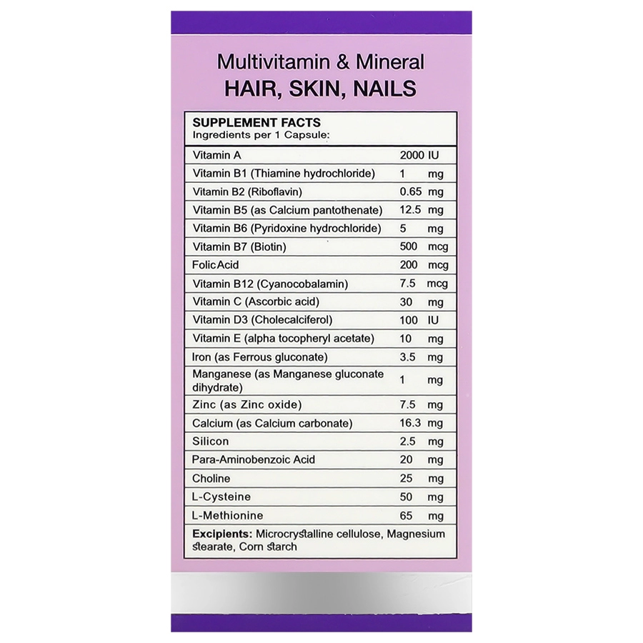 این کپسول حاوی ویتامینهای مفید برای پیشگیری از سفید شدن مو و همچنین ریزش آنها است. ویتامینهایی مانند B5 و B12 و ماده معدنی روی از سفید شدن زودرس موها پیشگیری میکند. فولیک اسید موجود در این کپسول علاوه بر جلوگیری از ریزش موها به رشد مجدد و استحکام آنها کمک میکند. ویتامینهای A ،E ،C و برخی ویتامینهای گروه B مانند B12 و B9 به حفظ سلامت و شادابی پوست کمک میکنند و از ایجاد چین و چروک بر روی پوست نیز جلوگیری میکنند. همچنین این ویتامینها اثرات منفی رادیکالهای آزاد را خنثی میکنند. با مصرف این کپسول ویتامینهای لازم برای رشد و استحکام ناخنها نیز تامین میشود. ویتامینهایی چون D3 ،B7 ،B9 و B6 که از ویتامینهای لازم جهت رشد ناخنها و پیشگیری از شکستن آنها هستند همگی در این کپسول موجود هستند.
