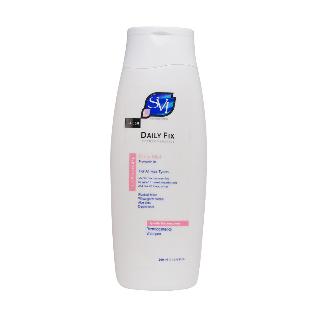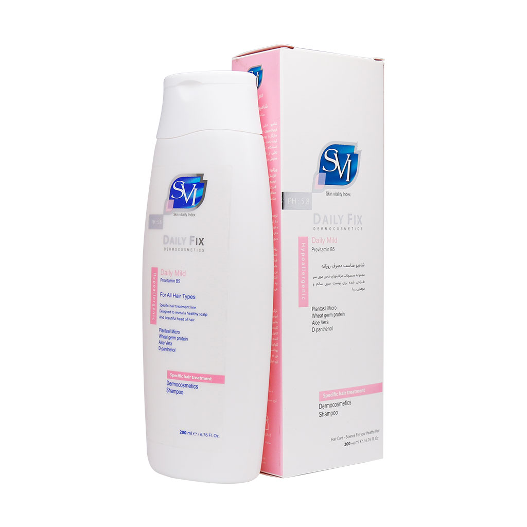 شامپو روزانه دیلی فیکس اس وی آی برای شستشوی انواع موها استفاده می‌شود. شامپو Daily Fix محصولی از برند SVI است و با بهره‌گیری از فرمولاسیون منحصر به فرد و PH متعادل و سازگار با پوست سر، از ساقه موها محافظت کرده باعث رطوبت‌رسانی به موها و افزایش مقاومت و استحکام آنها می‌شود. این محصول همچنین آثار مخرب ناشی از اشعه ماورای بنفش و آلودگی‌های محیطی بر موی سر را خنثی می‌نماید. حالت پذیری، لطافت و درخشندگی موهای شما پس از مدتی استفاده از این شامپو برای موی معمولی بهبود یافته و تاثیر آن را به وضوح مشاهده خواهید کرد. شامپو دیلی فیکس حاوی پرو ویتامینB5 است و استحکام موهای شما را افزایش می‌بخشد. یکی دیگر از مواد موثر دیگری که در این محصول موجود است، روغن جوانه گندم بوده که در قسمت زیر به خواص آن خواهیم پرداخت.