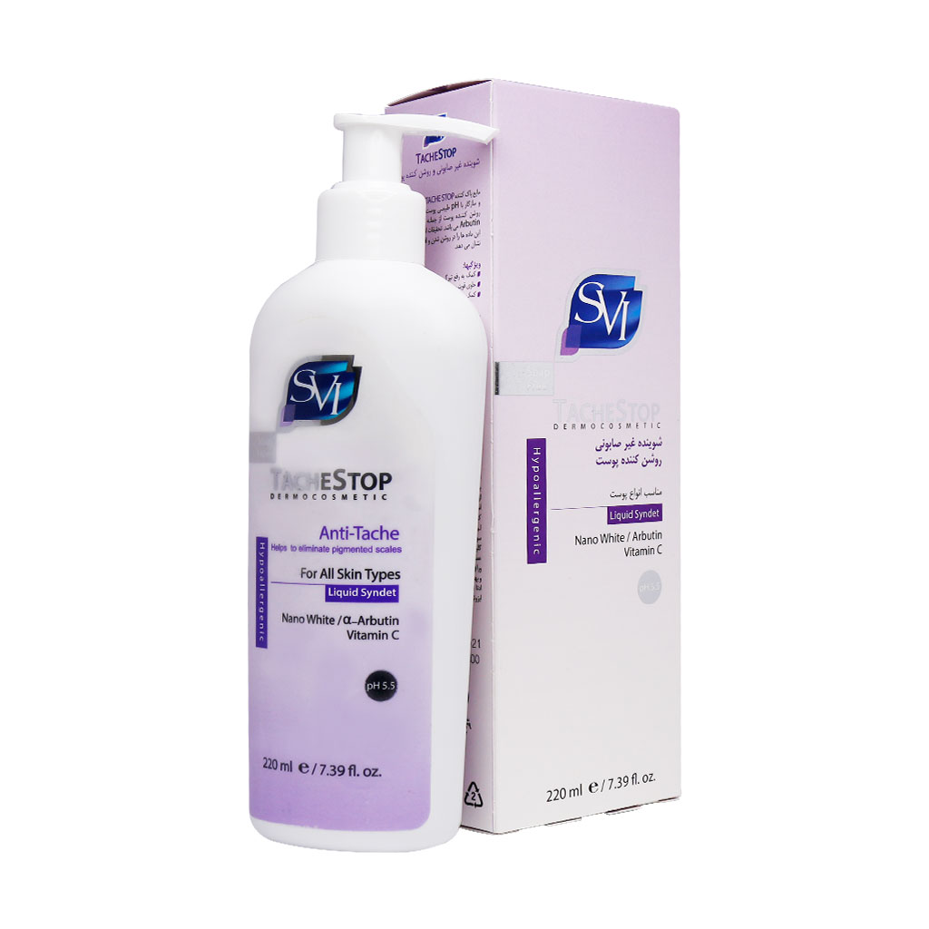 پن مایع روشن کننده پوست اس وی آی مدل Anti Tache یک شوینده ملایم است. همانطور که میدانید شویندههای حاوی صابون ممکن است PH پوست را از حالت طبیعی خارج کرده و نرمی و لطافت پوست را از بین ببرند. اما خوشبختانه پن مایع روشن کننده پوست اس وی آی، فاقد صابون بوده و با PH طبیعی پوست سازگار است. این محصول رنگ پوست را روشن میکند، تیرگیهای پوست را از بین برده و مانع از بروز لک در سطح پوست میشود. پن حاوی قویترین و جدیدترین ترکیبات روشنکننده است که کمک شایانی به افزایش شفافیت و یکنواخت شدن رنگ پوست میکند.