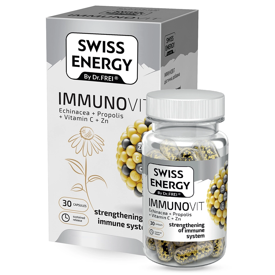 کپسول ایمونوویت سوییس انرژی ترکیبی از عصاره گیاه اکیناسه، عصاره پروپولیس زنبور عسل، ویتامین ث و زینک است که برای تقویت سیستم ایمنی موثر عمل می‌کند. این مکمل به شکل کپسول‌های آهسته رهش حاوی پلت‌هایی است که ماده موثره را به تدریج آزاد می‌کنند، به گونه ای که باعث جذب بهتر فرآورده و کاهش عوارض می‌شود. این مکمل با خاصیت آنتی اکسیدانی خود از بدن در مقابل رادیکال‌های آزاد محافظت می‌کند و از ابتلا به بیماری‌ها جلوگیری می‌نماید. به طور کلی می‌توان گفت قرص تقویت سیستم ایمنی بدن شما را در مقابل بیماری‌ها مقاوم می‌کند و با توجه به تحت لیسانس بودن آن از کیفیت بالایی برخوردار است.