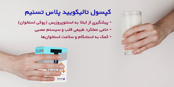 کپسول تالیکویید پلاس تسنیم مکملی جهت جلوگیری از پوکی استخوان و ترمیم مفاصل بوده که برای استفاده خانمها و آقایان به خصوص سالمندان فرموله شده است.