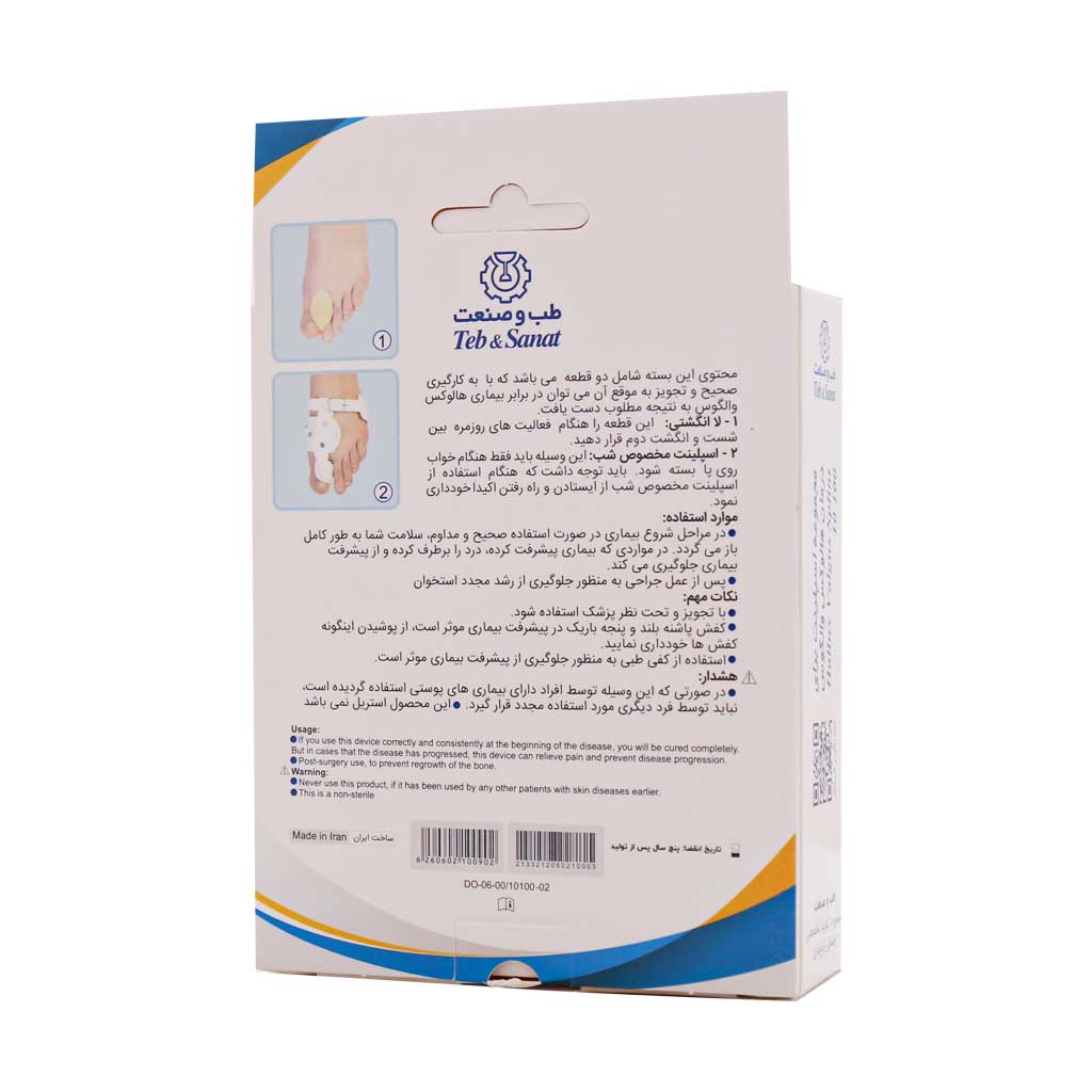 اسپلینت هالوکس والگوس پای چپ طب و صنعت کد 10100 برای درمان هالوکوس والگوس و پیشگیری از آن استفاده میشود. همچنین قبل از عمل جراحی برای جلوگیری از رشد استخوانها کاربرد دارد.