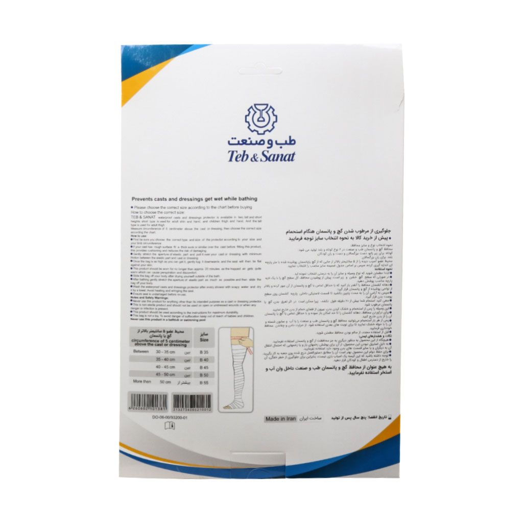 محافظ گچ و پانسمان در حمام طب و صنعت کد 93200 برای ران بزرگسالان قابل استفاده است. جنس این محصول به گونه ای است که از مرطوب شدن گچ و یا پانسمان هنگام استحمام جلوگیری میکند.