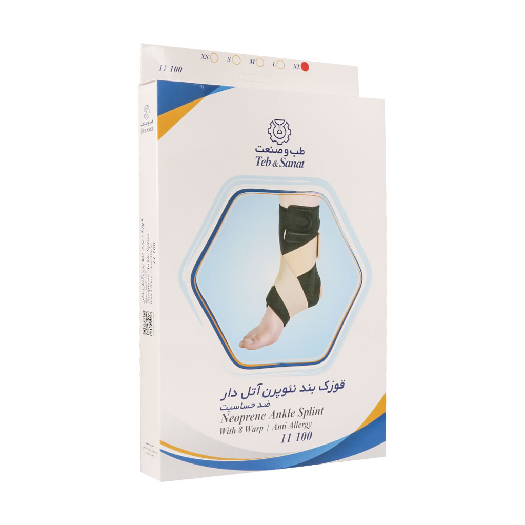 قوزک بند آتل دار طب و صنعت کد 11100 با استفاده از بهترین نئوپرن وارداتی که لایه داخلی آن از جنس کتان حوله ای می باشد تولید شده و در صدمات شدید بافت نرم مچ پا به کار گرفته می شود. علاوه بر محدود کردن حرکات و حمایت از مفصل مچ پا، با ایجاد گرما و بالا بردن درجه حرارت موضعی، گردش خون عضو را نیز افزایش می دهد که همین امر موجب می شود تا ضمن بهبودی سریع تر بیماری، تورم و خشکی نسوج و مفاصل از بین برود.