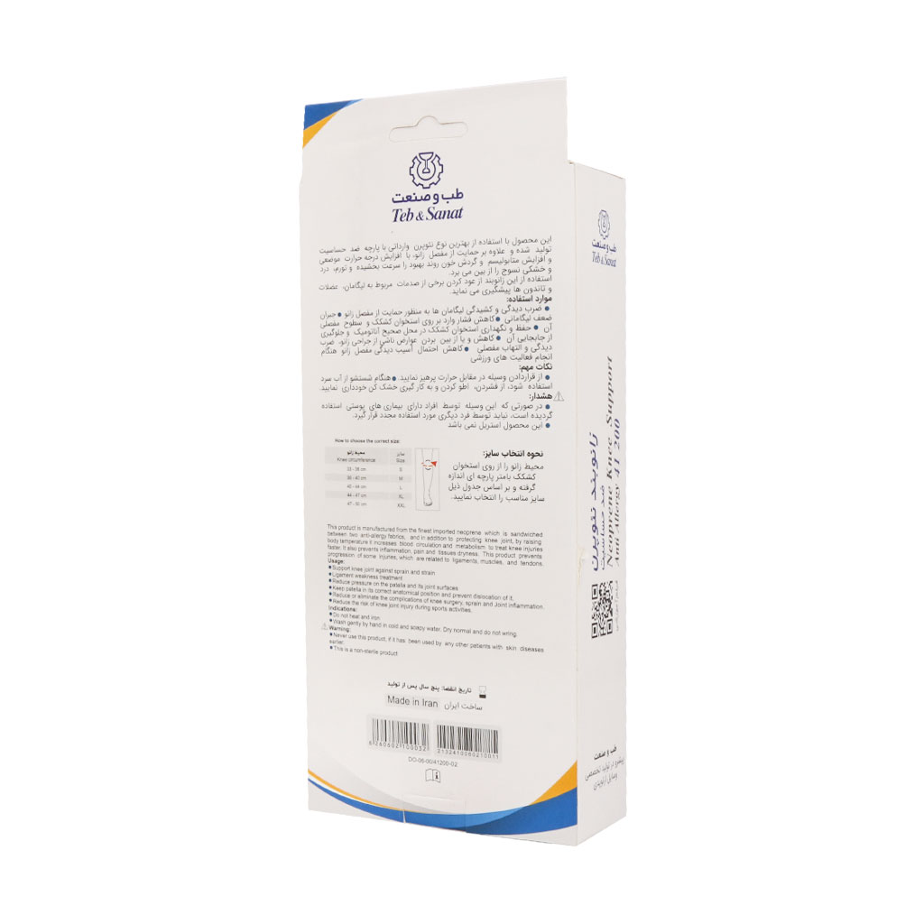 زانو بزرگترین مفصل بدن بوده و هم حرکات لولایی بصورت خم و باز شدن دارد و هم تا حدودی می تواند حرکات چرخشی حول محور طولی را انجام دهد. مفصل زانو بیش از هر مفصل دیگری در بدن مستعد آسیب دیدن است و این به خاطر نیروهای زیادی است که این مفصل باید تحمل کند. زانو بند نئوپرن طب و صنعت کد 41200 با استفاده از بهترین نوع نئوپرن وارداتی همراه با دو لایه پارچه ضد حساسیت تولید شده و از کشکک و لیگامان های طرفی زانو محافظت می کند.