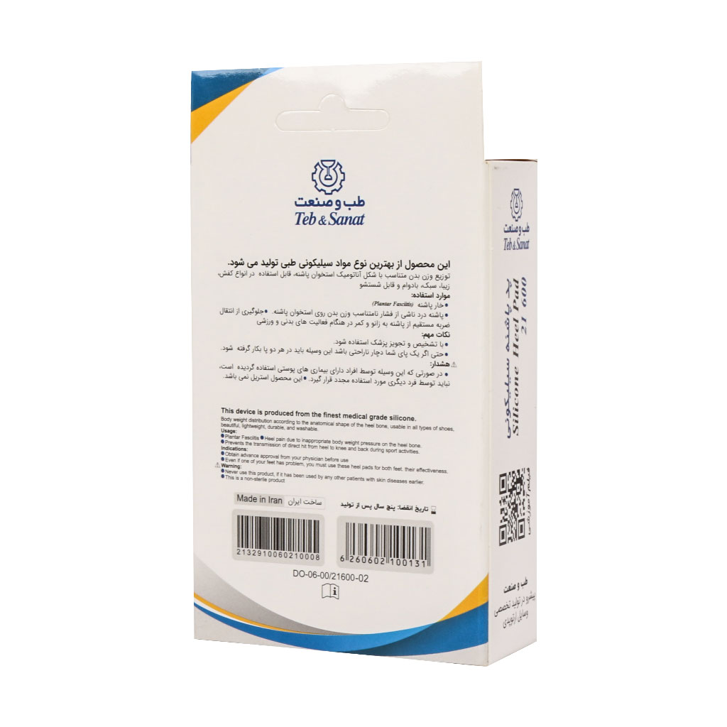 پد پاشنه سیلیکونی طب و صنعت کد21600 نوعی بالشتک پر شده از ماده سیلیکون است که در ناحیه پاشنه یا در داخل کفش جای می گیرد و باعث توزیع بهتر فشار کف پا می گردد. این پدها در اندازه ها و ابعاد گوناگون یافت می شوند و جهت درمان خار پاشنه مورد مصرف می باشد. ساختمان پد پاشنه طوری طراحی شده که وزن بدن متناسب با شکل آناتومیک استخوان پاشنه توزیع می گردد. ابعاد پد طوری است که در انواع کفش قابل استفاده بوده و باعث بیرون زدن پاشنه از کفش نمی شود. از ویژگی های این پد پاشنه می توان به مواردی چون دوام، زیبایی، سبکی، راحتی، قابل شستشو بودن آن اشاره کرد.