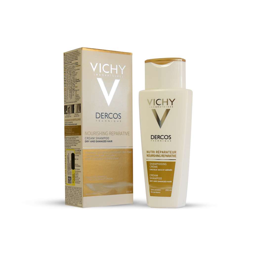 با نام Dercos Nourishing Cream Shampoo جهت ترمیم و تقویت مو هایی که در اثر عوامل مختلف خشک و آسیب دیده شده، مورد استفاده قرار می گیرد. سری محصولات Dercos جهت مراقبت از انواع مو طراحی و تولید شده است. این شامپو ترمیم کننده موهای آسیب دیده غنی شده با کمپلکس کراتین و روغن های گیاهی طبیعی، از الیاف مو محافظت کرده و مو را تغذیه می نماید. حالت شامپو کرمی تقویت کننده و ترمیم کننده ویشی موجب نرم شدن مو ها، درخشش و شادابی آن شده و از گره خوردگی مو جلوگیری می کند.