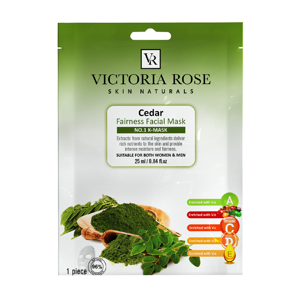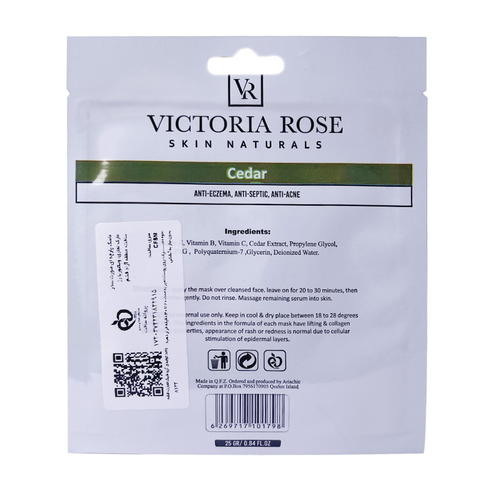 ماسک ورقه ای صورت سدر ویکتوریا رز حاوی عصاره سدر، ویتامین‌های E، C، B و گلیسرین است. این ترکیبات باعث رطوبت رسانی، ضد عفونی کنندگی و جلوگیری از جوش و اگزمای پوست می‌شوند. ماسک پارچه ای ویکتوریا رز به گونه‌ای فرموله شده که آقایان و بانوان با هر نوع پوستی می‌توانند از این محصول استفاده نمایند. این محصول با لایه برداری ملایم صورت به پاکسازی عمیق پوست و کاهش چین و چروک کمک می‌کند. همچنین به واسطه دارا بودن سدر باعث سم زدایی و پاک نمودن آلودگی‌ها می‌شود. ماسک صورت ویکتوریا رز حاوی عصاره سدر یک گزینه فوق العاده به جهت حفظ آب در سلول‌های پوستی است. در نتیجه اگر پوست خشکی دارید و به آبرسانی نیازمند هستید خرید ماسک صورت معرفی شده به شدت برای شما مناسب است.