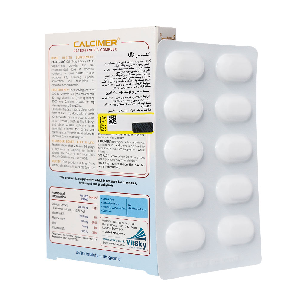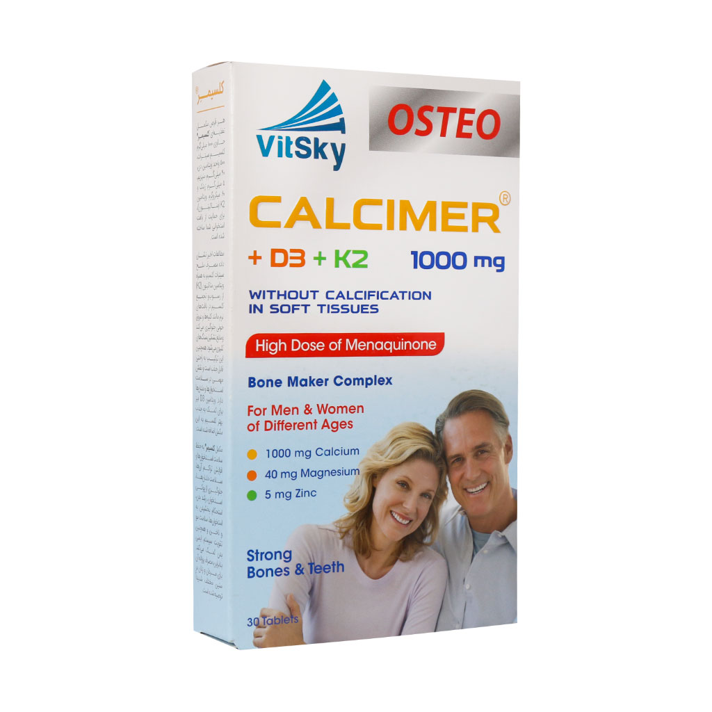 هر قرص کلسیمر ویت اسکای حاوی 1000 میلی گرم کلسیم سیترات، 500 واحد ویتامین دی، 40 میلی گرم منیزیم، 5 میلی گرم زینک و 60 میکروگرم ویتامین K2 یا مناکینون بوده که برای حمایت از بافت استخوانی شما ساخته شده است. مطالعات اخیر نشان داده مصرف ملح سیترات کلسیم به همراه ویتامین کا2 از رسوب و تجمع کلسیم در بافتهای نرم مانند کلیهها و عروق خونی جلوگیری میکند و مانع تشکیل سنگهای کلیوی میشود. همچنین این ترکیب به راحتی قابل جذب است و نقش مهمی در سلامت استخوانها و دندانها دارد.