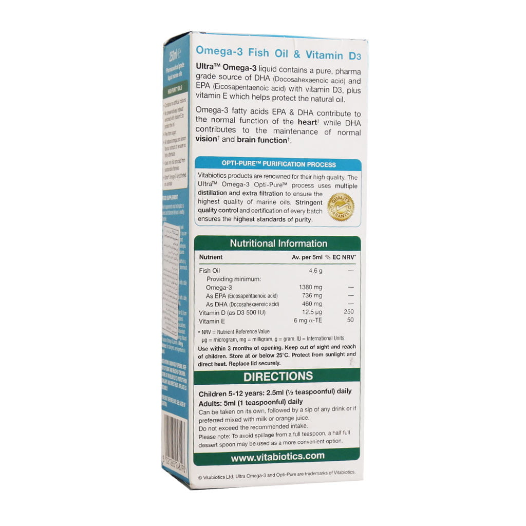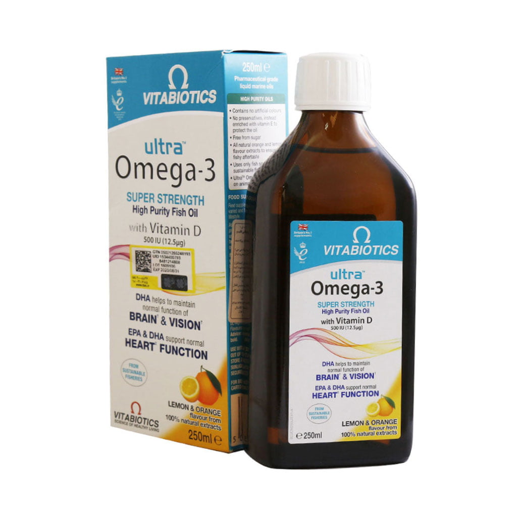 شربت اولترا امگا3 همراه با ویتامین D ویتابیوتیکس مقادیر حداکثری از اسیدهای چرب DHA و EPA بعلاوه ویتامین D و E جهت تضمین رشد کودکان، سلامت و بینایی و سلامت قلب و عروق دارد.