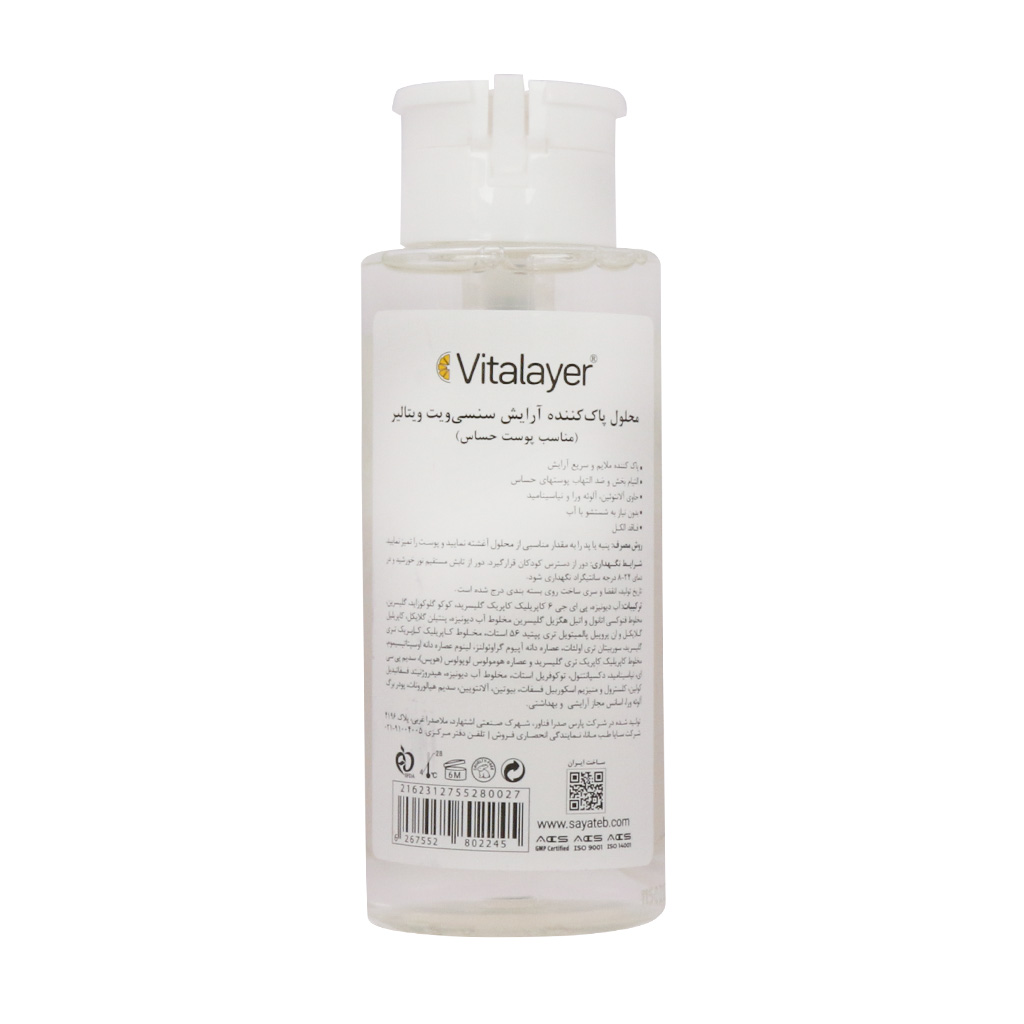محلول پاک کننده آرایش سنسی ویت ویتالیر مناسب پوست حساس بوده و با فرمولاسیون ملایم علاوه بر پاک نمودن آلودگی از روی پوست، خاصیت التیام بخشی و ضد التهاب نیز دارد. این محلول بدون نیاز به شستشو با آب است.