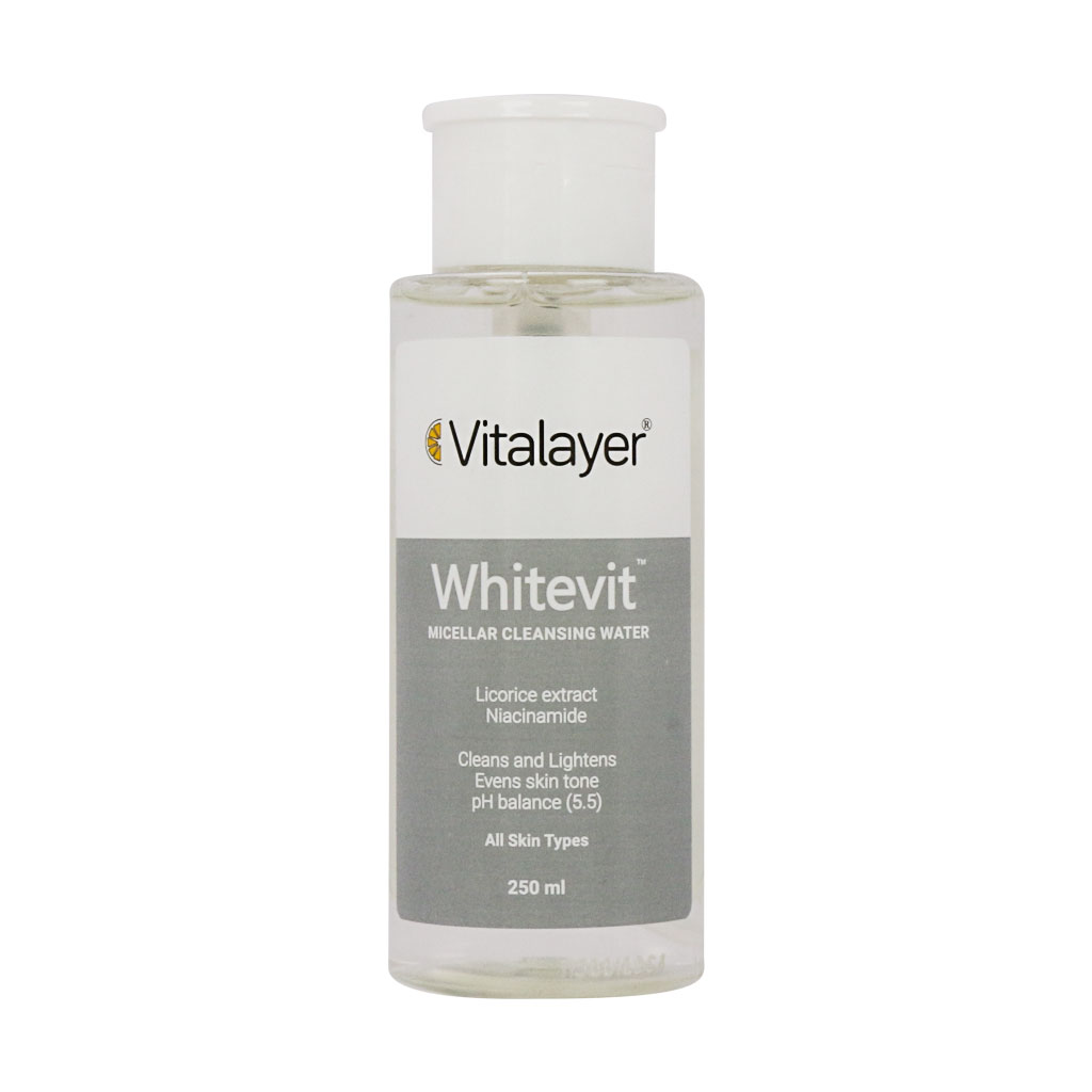 محلول پاک کننده آرایش وایت ویت ویتالیر مناسب پوست های کدر و مستعد لک بوده و یک پاک کننده فوق العاده با قابلیت روشن کنندگی به شمار میآید. این محصول به راحتی مواد آرایشی و آلودگیها را از پوست تمیز کرده و باعث کاهش لکها و روشن شدن پوست میشود. میسلار واتر روشن کننده وایت ویت ویتالیر پس از مصرف نیاز به شستشو با آب ندارد و به دلیل نداشتن الکل و پارابن، هیچ گونه حساسیت و التهاب پوستی ایجاد نمیکند.