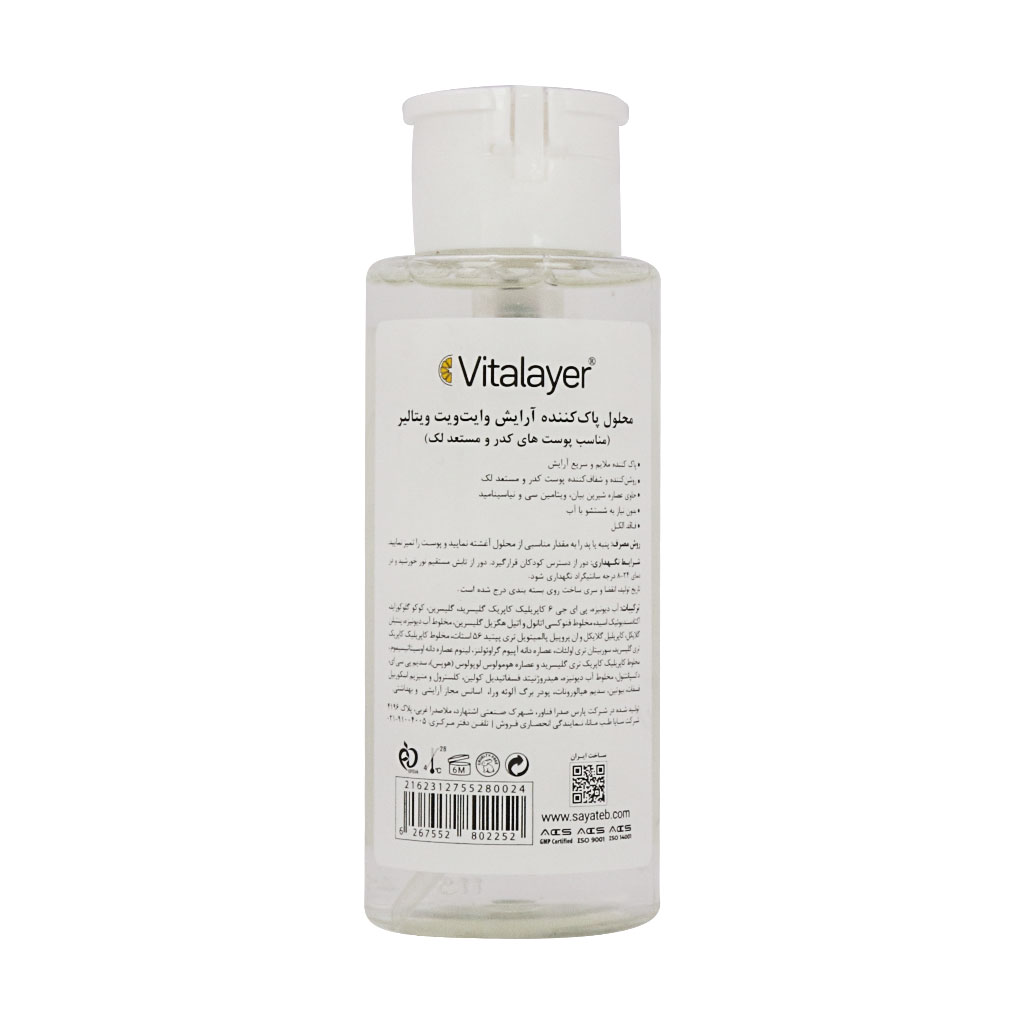محلول پاک کننده آرایش وایت ویت ویتالیر مناسب پوستهای کدر و مستعد لک با داشتن ترکیبات مختلف علاوه بر پاک کردن ملایم و سریع آرایش، روشن کننده و شفاف کننده پوست نیز هست. بعد از استفاده از این محصول نیاز به شستشو با آب نیست.