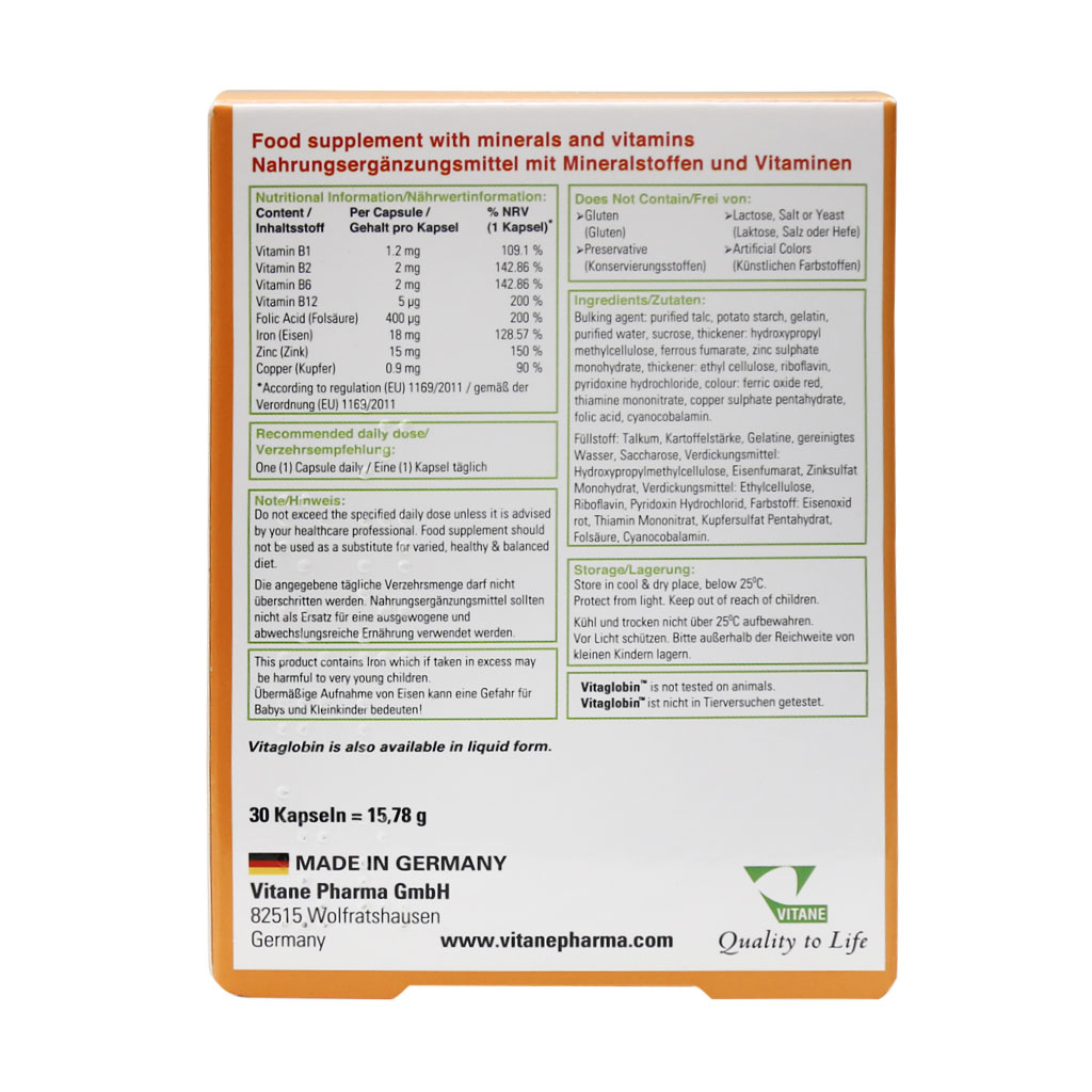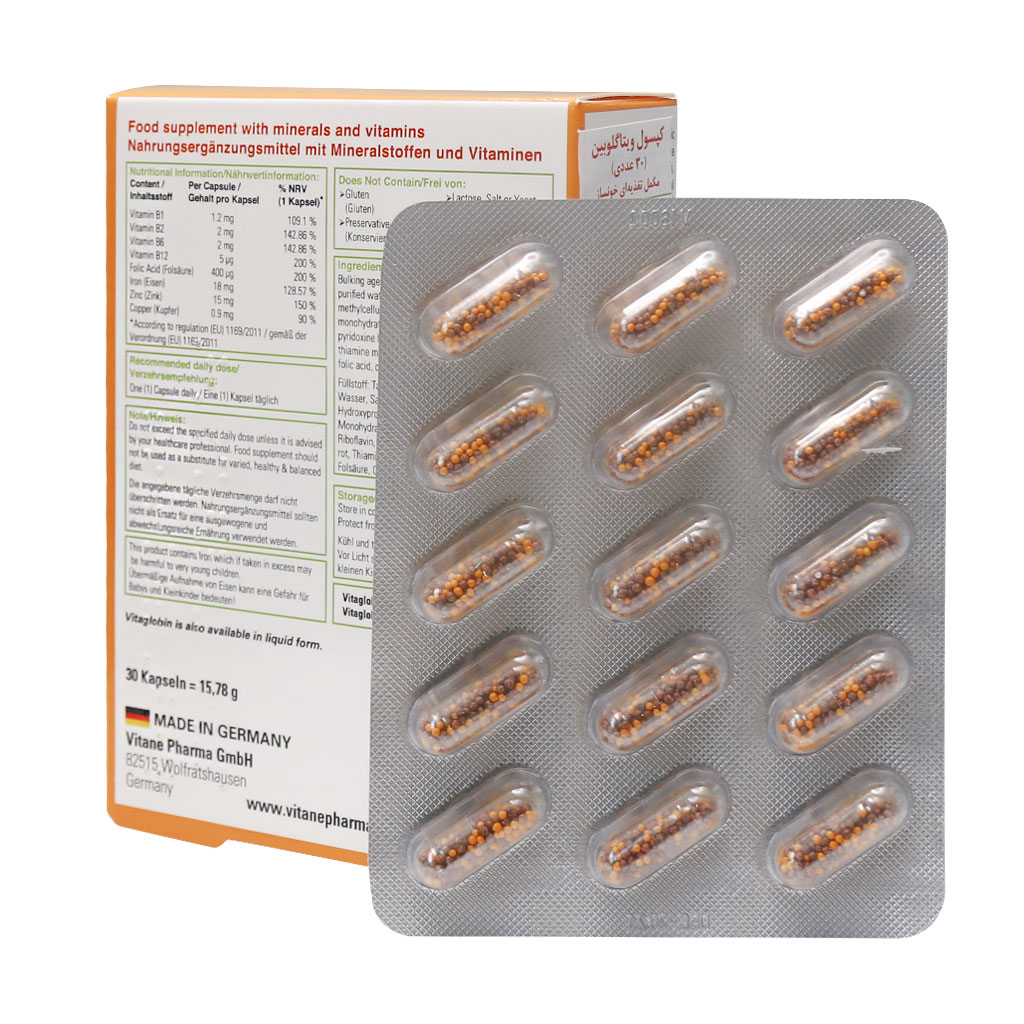 کپسول ویتاگلوبین ویتان ساخت کشور آلمان محصولی کم نظیر در پیشگیری و درمان کم خونی است. این محصول تمامی ریزمغذیهای لازم برای سلامت بدن را دارا بوده که آن را تبدیل به یک مکمل محبوب و پرفروش نموده است. این مکمل علاوه بر آهن از ویتامینهای موجود در آن، B1, B2, B6 و B12 را میتوان نام برد،