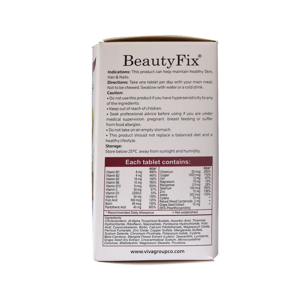 قرص روکشدار بیوتی فیکس ویتاویوا با داشتن انواع ویتامین و مواد معدنی در سلامت پوست، مو و ناخن موثر است. کاهش ریزش مو، تقویت مو و ضخیم شدن تارهای آن، افزایش استقامت ناخنها و تقویت پوست از جمله کاراییهای این محصول است.