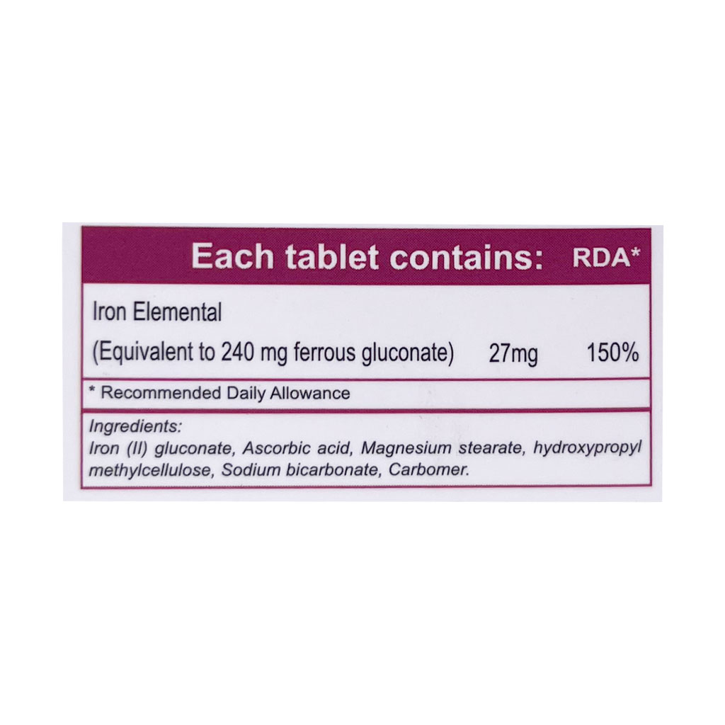حاوی 240 میلی گرم فروس گلوکونات ( معادل 27 میلی گرم عنصر آهن)، 40 میلی گرم آسکوربیک اسید