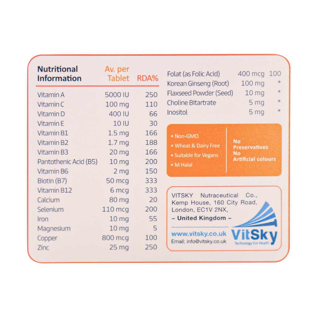 قرص دیلی فرش ویت اسکای حاوی جینسینگ بوده و به سلامت عمومی بدن کمک موثری میکند. این فراورده تمامی ویتامینهای مورد نیاز بدن را تامین میکند.