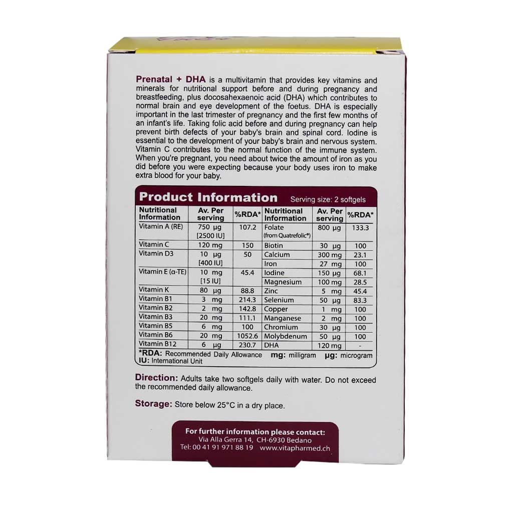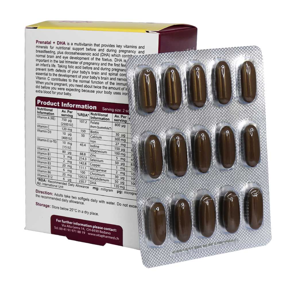 سافت ژل پریناتال پلاس دی اچ ای ویواتیون با داشتن انواع ویتامین، مینرال و  DHA یک مکمل مناسب جهت حفظ سلامت مادر و جنین در دوران بارداری و شیردهی است.