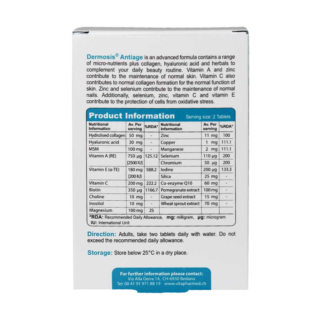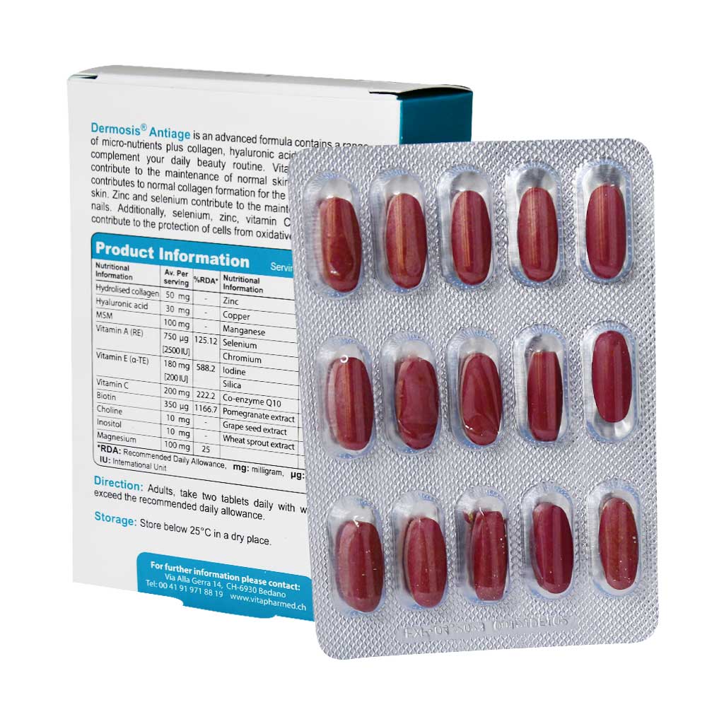 قرص درموسیس آنتی ایج ویواتیون با دارا بودن انواع ویتامین‌ها، مواد معدنی و دیگر ترکیبات منحصر به فرد به حفظ سلامت پوست و ناخن و حفاظت از سلول‌ها در برابر آسیب‌های اکسیداتیو کمک می‌نماید.