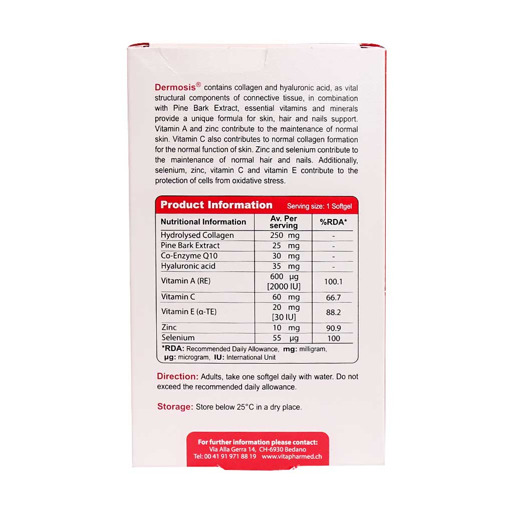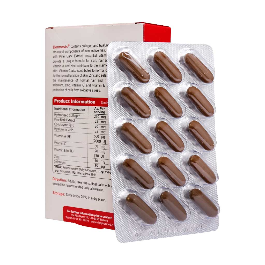 سافت ژل درموسیس ویواتیون حاوی ترکیب منحصر به فردی از ویتامین‌ها، مواد معدنی، کلاژن هیدرولیز، هیالورونیک اسید، کوانزیم کیوتن و عصاره پوست درخت کاج است. درموسیس ویواتیون از سلامت پوست، مو و ناخن حمایت نموده و از سلول‌ها در برابر استرس اکسیداتیو محافظت می‌نماید. این مکمل با دارا بودن ویتامین‌هایی مانند a، c و e به عنوان یک مولتی ویتامین موثر برای پوست شناخته شده است و موجب از بین بردن سلول‌های مضر می‌شود.