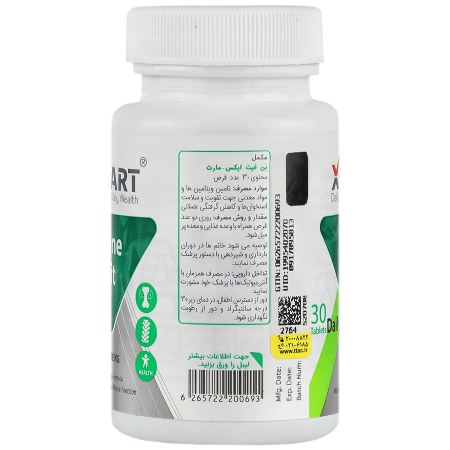 قرص بن فیت ایکس مارت ویتامینها و مواد معدنی مهمی را برای بدن تامین میکند که نقش مهمی در سلامت استخوانها، مفاصل، غضروف و ماهیچهها دارند. این مکمل جهت تقویت و سلامت استخوان و کاهش گرفتگی عضلانی قابل مصرف است.