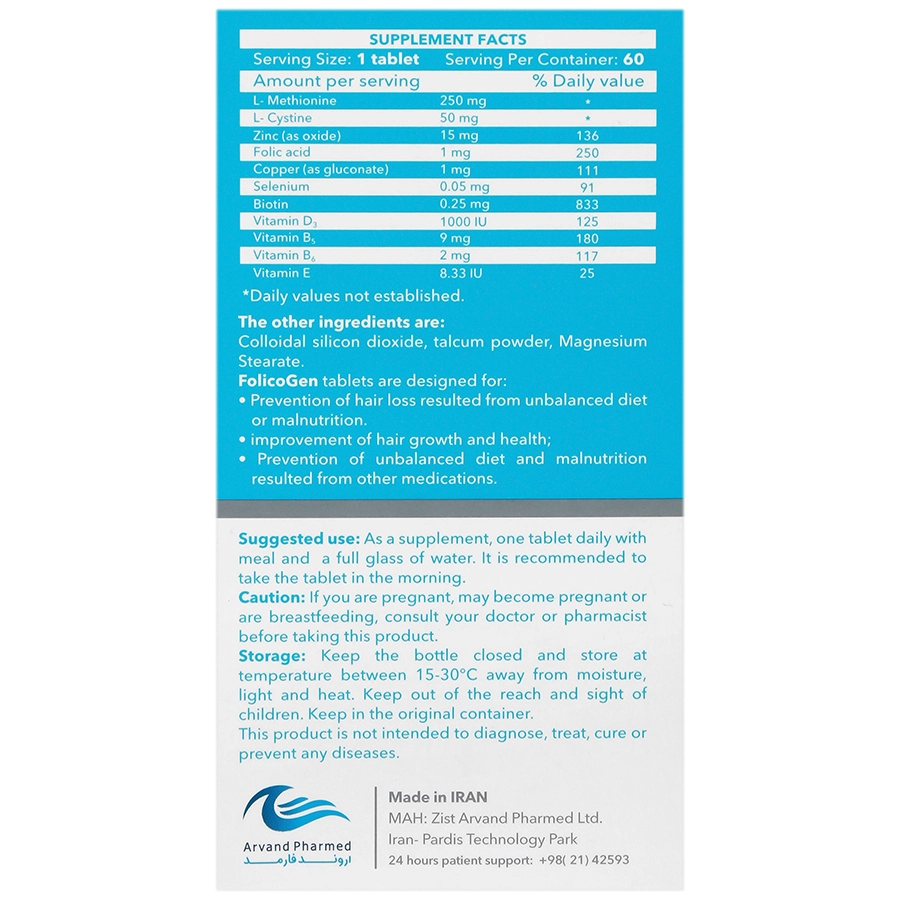 قرص فولیکوژن اروند فارمد حاوی ویتامین‌ها، املاح معدنی و مواد مورد نیاز برای پیشگیری و درمان ریزش مو است. رژیم‌های غذایی نامناسب و سوء تغذیه از عوامل ریزش مو هستند که به کمک این محصول می‌توان به درمان این مشکلات پرداخته و موهایی سالم و پرپشت داشت.
