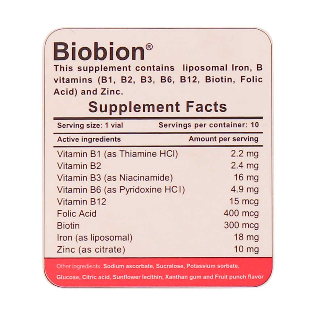 ویال خوراکی بایوبیون زیست تخمیر حاوی آهن لیپوزومال به همراه ویتامینهای ب کمپلکس و زینک است. بایوبین از سری محصولات جدید زیست تخمیر است که به رفع کم خونی ناشی از فقر آهن کمک کرده و باعث ارتقای سلامت عمومی بدن میشود. آهن موجود در این مکمل به فرم لیپوزومال است که از پیشرفتهترین انواع آهن بوده و دارای بیشترین هم زیستی با بدن است و این مسئله باعث میشود که این نوع از آهن به خوبی جذب بدن شود و حداقل عوارض گوارشی را ایجاد کند. ویال آهن بایوبیون زیست تخمیر به شکل تک ویال مایع خوراکی طراحی شده است و در هر بسته 10 عدد ویال 10 میلی لیتری است که برای پذیرش بهتر محصول نیز طعم پانچ میوه به بایوبیون پرو زیست اضافه شده است.